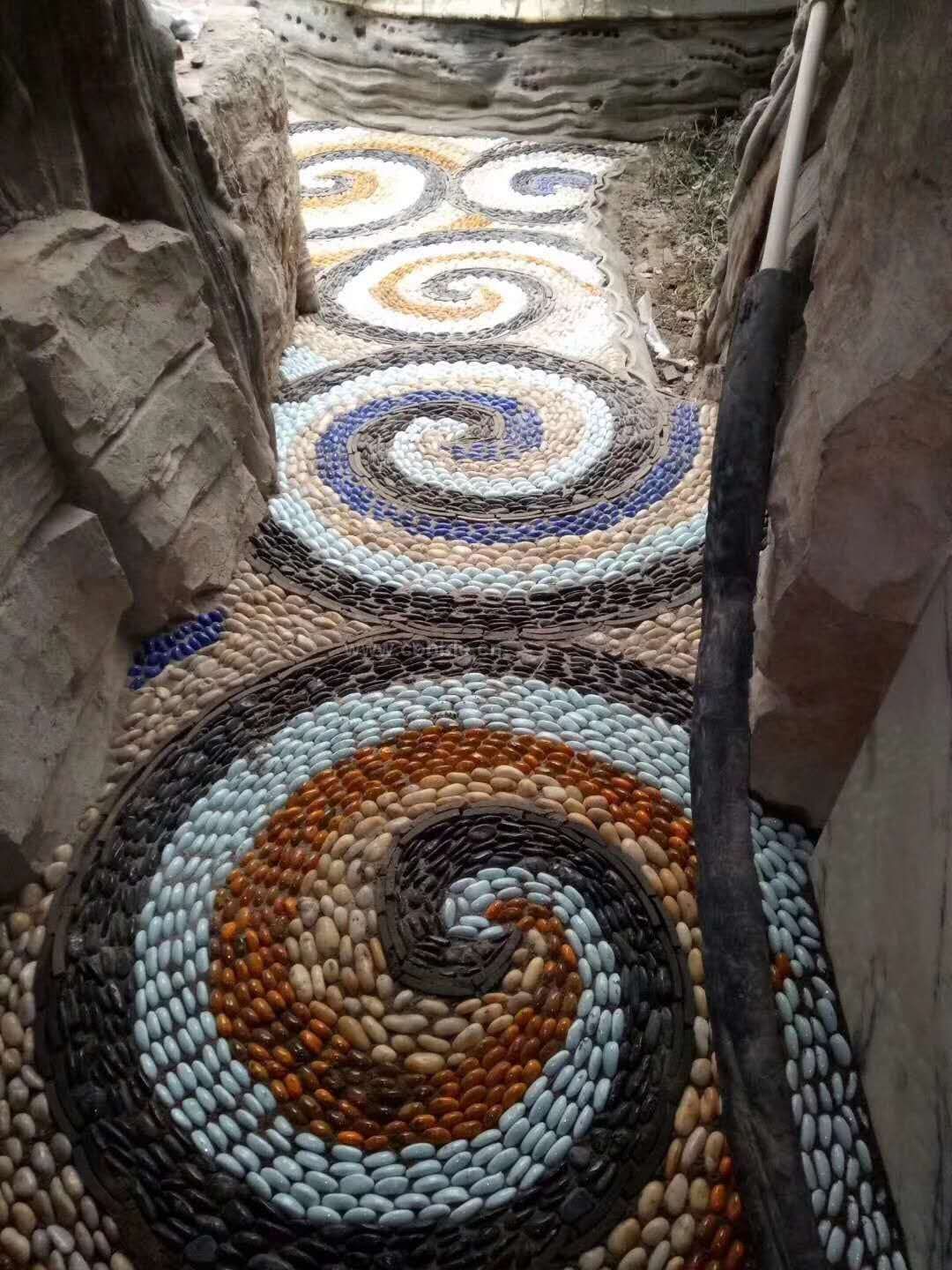 填充鹅卵石这个工序比较关键,你可以按照你想要的纹路安放鹅卵石,安放的时候把鹅卵石的3分之2左右厚度插入水泥干灰中,间距要密一点,石头与石头几乎都是靠在一起的,间距太松了做完以后石头不清晰,不好看!安放石头的时候要控制石头表面在一个水平面上