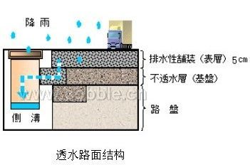 透水、低噪音路面采用开级配、大空隙透水混凝土作为路面面层,通过面层的大空隙将路面水渗入路面内部并渗入地下。由于面层材料具有较大的孔隙,是多空隙材料,可以吸收一定的交通噪音,因而也具有一定的降噪功能。结构路面见下图: 透水、低噪音路面特点: 1.使用大颗粒骨料、添加剂等材料配合而成的透水混凝土。 2.空隙率:15%至25%,为开粒度、大空隙透水混凝土。 3.透水系数:1.7x10-2cm/s. 以上。